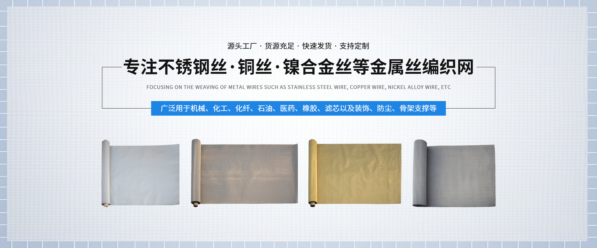 新鄉市中南金屬網有限公司成立于1999 年,公司設在河南省新鄉市。在過去的十幾年來,我們堅持以嚴格的管理措施、雄厚的技術力量、良好的工藝設施,質量上乘、信譽為上為原則,把樹立良好的企業形象為工作宗旨,歷經市場的嚴峻考驗并贏得廣大用戶的一致好評。金屬絲網編織結構形式有平紋和斜紋兩種方法,嚴格按照航空軍品標準HB1862—93和標準GB/T5330—2003標準,并等效采用國際標準ISO9044—90標準組織生產。  公司擁有生產設備和技術人員,主要生產不銹鋼篩網、磨料網、金屬絲編織方孔網、篩網、濾網 、篩分網 、過濾網、不銹鋼網、絲網、金屬絲網、金屬絲編織密紋網、特種網、不銹鋼密紋網、荷蘭網、席型網。絲網材質選用黃銅、錫青銅、不銹鋼、純鎳等。席型網規格7/44目—500/3500目,方孔網規格1/2目—500目,網孔25mm—0.028mm,產品廣泛用于機械、化工、化纖、石油、醫藥、橡膠、濾芯、固體果粒篩分、流體過濾以及裝飾、防塵、骨架支撐等。  我們以“視質量為生命、以信譽求生存、以科技促發展、以優*產品為客戶服務”的經營理念,真誠的希望與各界人士攜手并進,共創輝煌!